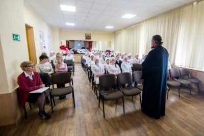 Ирина Викторовна и руководитель отдела молодежного служения священник Аркадий Махсумов вместе с будущими медиками посмотрели и обсудили фильм «Исцелить страх», 2015 г., реж. А. Пархоменко.
