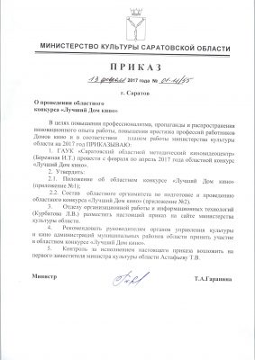1.1. Областной конкурс «Лучший Дом кино» (далее — Конкурс) проводится министерством культуры Саратовской области и ГАУК «Саратовский областной методический киновидеоцентр» в соответствии с планом работы министерства культуры области на 2017 год.