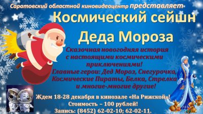 Киновидеоцентр может провести тематическое мероприятие «Веселый космический сейшн Деда Мороза» и показ фильмов фестиваля «Волшебный мир кино» для организованных групп школьников как на площадке любого образовательного учреждения, так и в кинозале «На Рижской» (ул. Рижская, д. 1, остановка общественного транспорта «Котельная»).