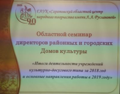 1 марта в Саратовском областном центре народного творчества имени Л.А.Руслановой состоялся семинар для директоров районных, городских Домов культуры и руководителей централизованных клубных систем области с участием министра культуры области Татьяны Гараниной. На мероприятии были подведены итоги деятельности учреждений культурно-досугового типа за 2018 год и определены направления работы на 2019 год.