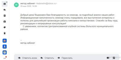 Впечатлениями от участия в семинаре уже поделились сотрудники кинотеатра «Победа» г.Балашова, Централизованной клубной системы Вольского муниципального района и директор кинотеатра «Луч» с.Питерка Клавдия Брюховецкая.