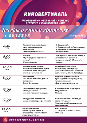Программа «Киновертикали 2020» 6 октября будет посвящена размышлениям кинематографистов о современном детском и юношеском кино, о миссии зрителей в нем. Поэтому организаторы фестиваля программу второго дня назвали «Беседы о кино и зрителях».