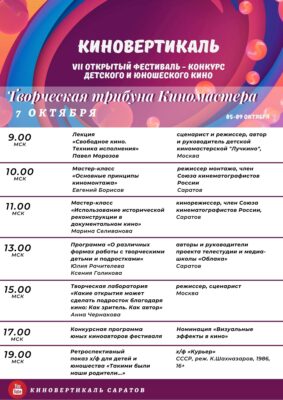 В ходе утренней образовательной программы в 9.00 (мск) будет представлен мастер-класс «Свободное кино. Техника исполнения» московского сценариста и режиссера, автора детской киномастерской «Лучкино» Павла Морозова. После этого зрители увидят мастер-классы известных саратовских кинематографистов: Марины Селивановой и Евгения Борисова.