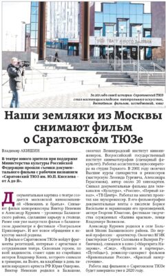 В сегодняшнем выпуске ИА «Регион 64» № 88 вышла публикация о съёмках документального фильма «Саратовский ТЮЗ им. Ю.П. Киселева от А до Я». Режиссерами киноленты выступили Виктор Невежин и Александр Курняев. Подробнее — в материале по ссылке https://sarnovosti.ru/archive/088/.