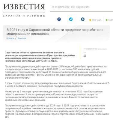 В 2021 ГОДУ В САРАТОВСКОЙ ОБЛАСТИ ПРОДОЛЖИТСЯ РАБОТА ПО МОДЕРНИЗАЦИИ КИНОЗАЛОВ