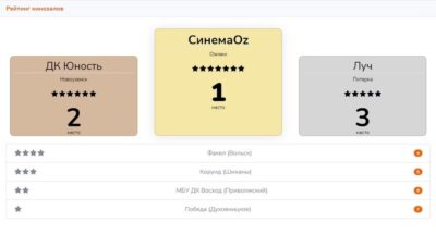 На первом месте по-прежнему озинский кинозал «СинемаOz», замыкает «тройку» Питерский «Луч».