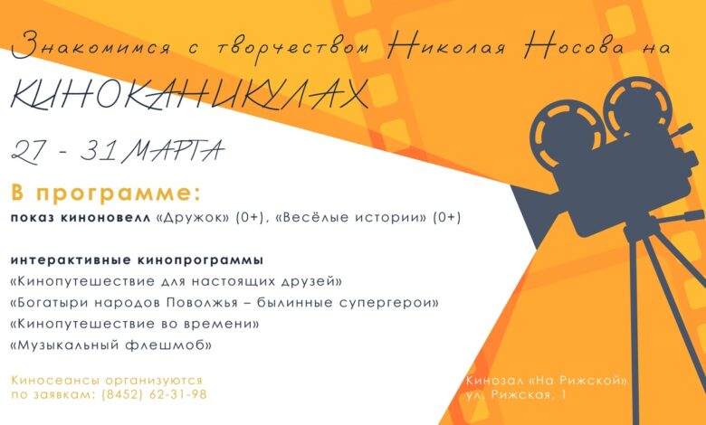 Вся неделя каникул будет посвящена творчеству одного из самых известных и любимых советских детских писателей — Николая Носова. В кинозале «На Рижской» юные зрители и их родители смогут посмотреть знаменитые экранизации его произведений: «Дружок» (0+) о приключениях верных друзей Мишки, Коли и их лохматого пса Дружка и «Весёлые истории» (0+). Это три киноновеллы, снятые по мотивам рассказов Н.Носова «И я помогаю», «Про Гену», «Телефон».