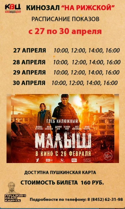 В кинозале «На Рижской» продолжаются показы военной драмы «Малыш» (Россия, 2026, реж. А. Симонов, 114 мин., 16+). Смотрите афишу: