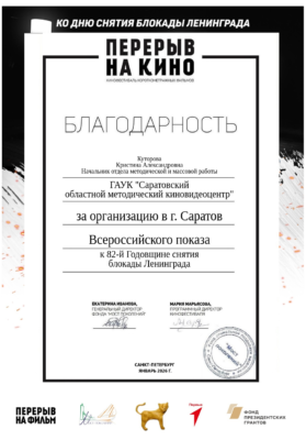 Главная→Нам говорят спасибо→Благодарность за показ ко Дню снятия блокады Ленинграда Благодарность за показ ко Дню снятия блокады Ленинграда